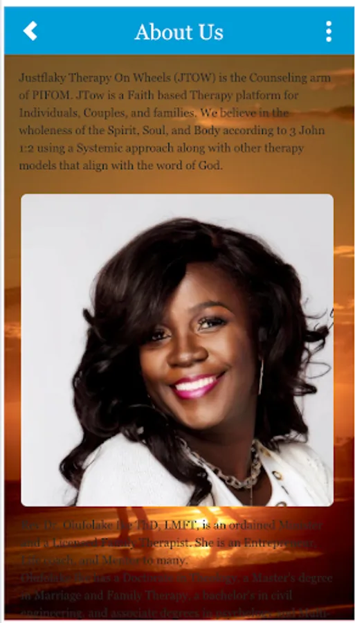 This app helps you grow body soul and spirit. Book appointment for therapy. You can ask for prayers and you will receive a word of encouragement. Shop Justflaky books Music and other building resources. Take care of your body by shopping organic products. find out about events organized by Justflaky and partners. Join our partners and donate to train a Christian counselor.