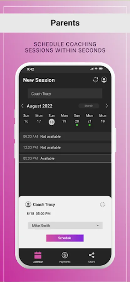 Finally, an app that makes it easy for parents of athletes to schedule coaching sessions. Parents and coaches will go from spending hours communicating back-and-forth to scheduling within seconds. Sports coaches will stay in control of their schedules and be able to easily communicate with parents of any changes.