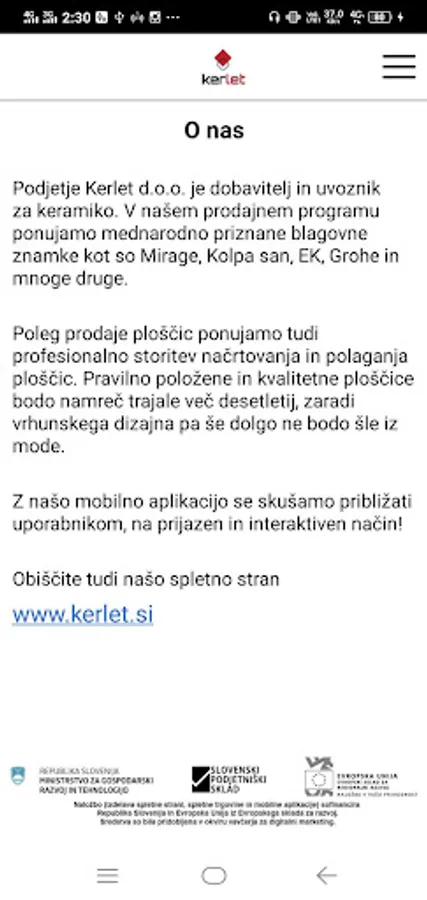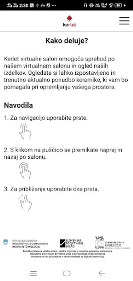 The Kerlet mobile application takes you into the virtual world of Ceramics. It allows you to walk around the virtual salon of the Kerlet company, where you can see the exposed and current offer of ceramics from renowned world manufacturers.