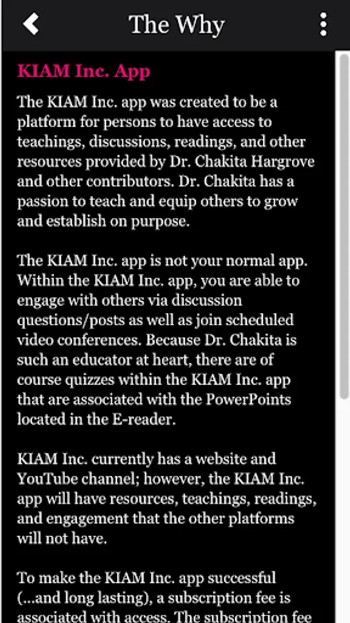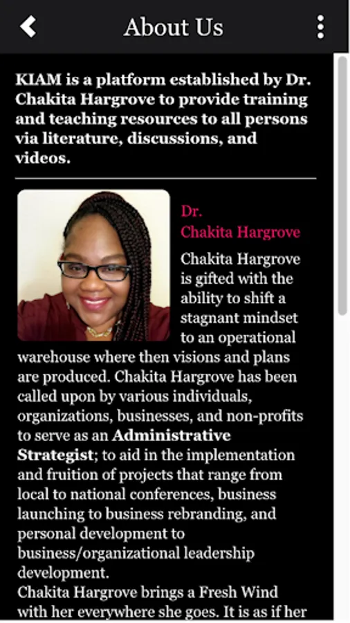 The KIAM Inc. app was created to be a platform for persons to have access to teachings, discussions, readings, and other resources provided by Dr. Chakita Hargrove and other contributors. Dr. Chakita has a passion to teach and equip others to grow and establish on purpose.