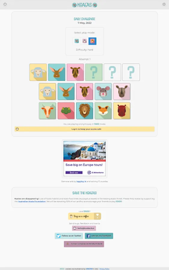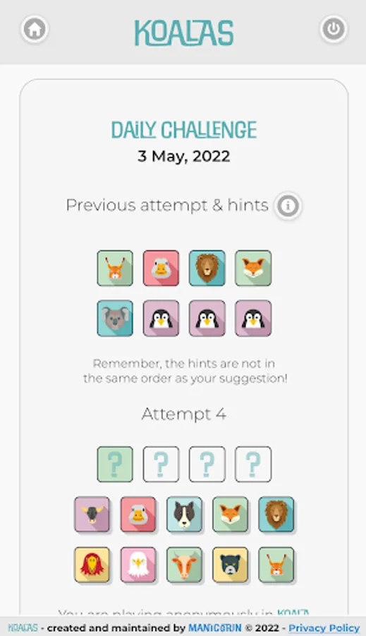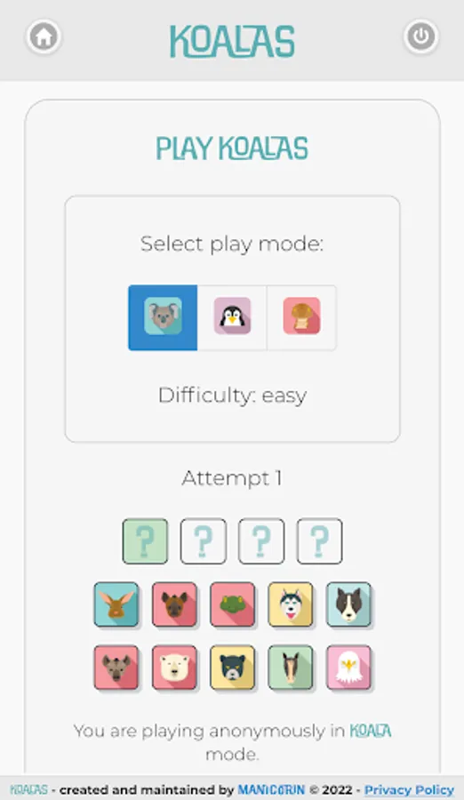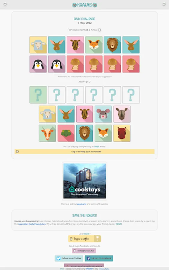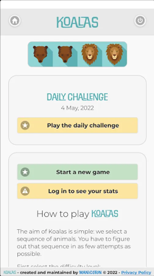 The aim of Koalas is simple. We select a sequence of animals. You have to figure out that sequence in as few attempts as possible. Based on the ancient game of Bulls and Cows (or, more recently, Mastermind), Koalas is a cool spin on a classic game.