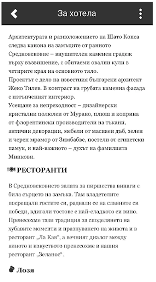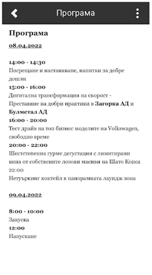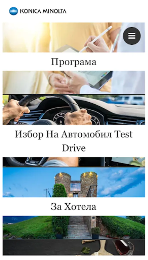 Application for the exclusive event of Conica Minolta Bulgaria in Chateau Copsa, including additional useful information for guests such as program, hotel information, tasting menu, contacts, location and direct contact with the organizers.