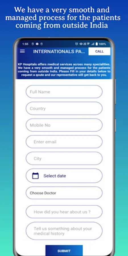 We have a very smooth and managed process for the patients coming from outside India. In application Fill in your details and request a qoute and our representative will get back to you.