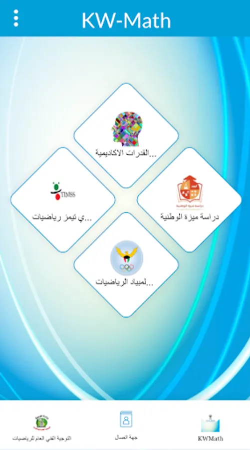 تطبيق يخدم مادة الرياضيات بدولة الكويت ويتضمن اختبارات للقدرات، واختبارات ميزا ،واختبارات تيمز، وألومبياد الرياضيات، وذلك للإرتقاء بمستوى الطالب.تطبيق يخدم مادة الرياضيات بدولة الكويت ويتضمن اختبارات للقدرات، واختبارات ميزا ،واختبارات تيمز، وألومبياد الرياضيات، وذلك للإرتقاء بمستوى الطالب.