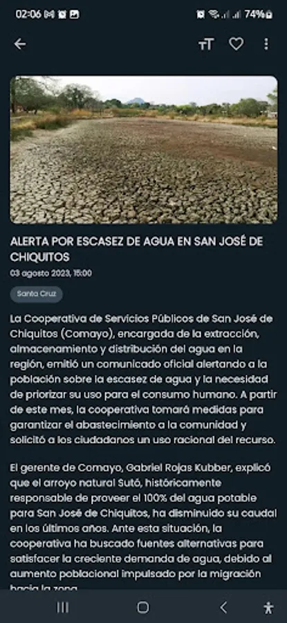 In short, the Santa Cruz de La Sierra news app is an essential tool for those who want to stay informed about the most relevant and up-to-date events in this Bolivian city. With its ability to provide real-time updates, a wide variety of sections and categories, an advanced search system, and the ability to customize the user experience, this app is the perfect companion for those who want to stay on top of everything. what happens in Santa Cruz de La Sierra and in the world.