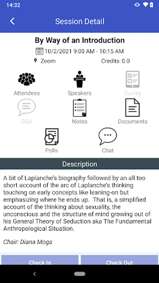 To earn CE while attending our sessions, be sure to check in and out through the app. After the end of a session, the survey will be delivered through the app automatically, allowing you to fill it out on your phone or tablet.