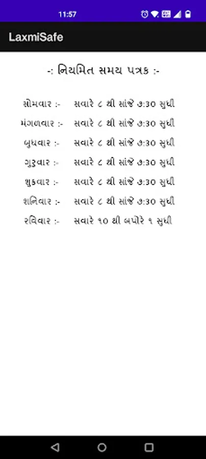 Laxmi safe deposit Walt provide locker based securities services. Laxmi Safe application is only surat/India based only laxmi safe walt's users. Laxmi Safe application purpose is provide time details to them users. Specially in Diwali holidays time schedule is different.