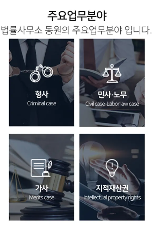 The main business areas of mobilization of law firms are criminal, civil, labor, household affairs, and intellectual property rights. Attorneys who specialize in each field thoroughly analyze and prepare clients' cases, and are doing their best to deliver satisfactory results. .