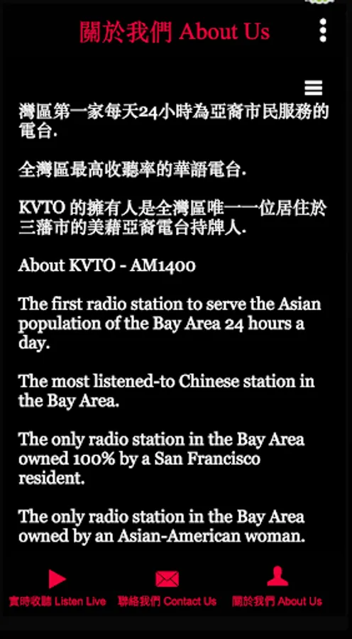 Listen Live to AM 1400 and FM 93.7 KVTO the first radio station to serve the Chinese population of the San Francisco Bay Area 24 hours a day and 7 days a week. Enjoy the live and local content on your Android device, when you are on the go.