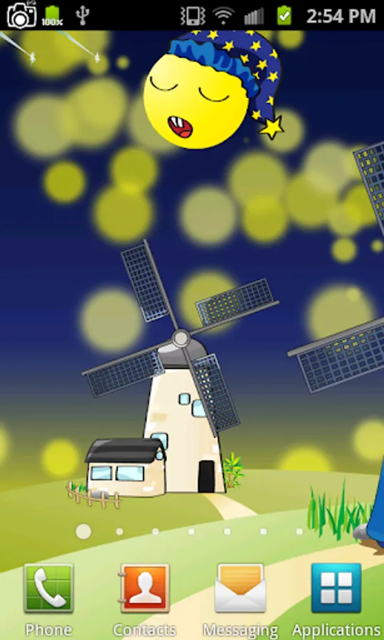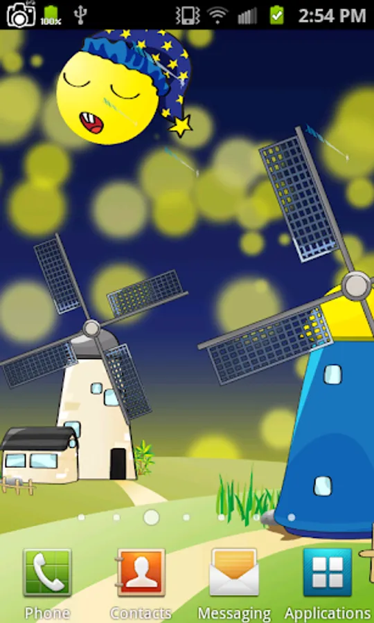 You will find that the wallpaper dispaly two cartoon windmills and the gree grassland, and the blue sky of the day,And if the wallpaper at night, it would display the night, the stars, and the meteors.