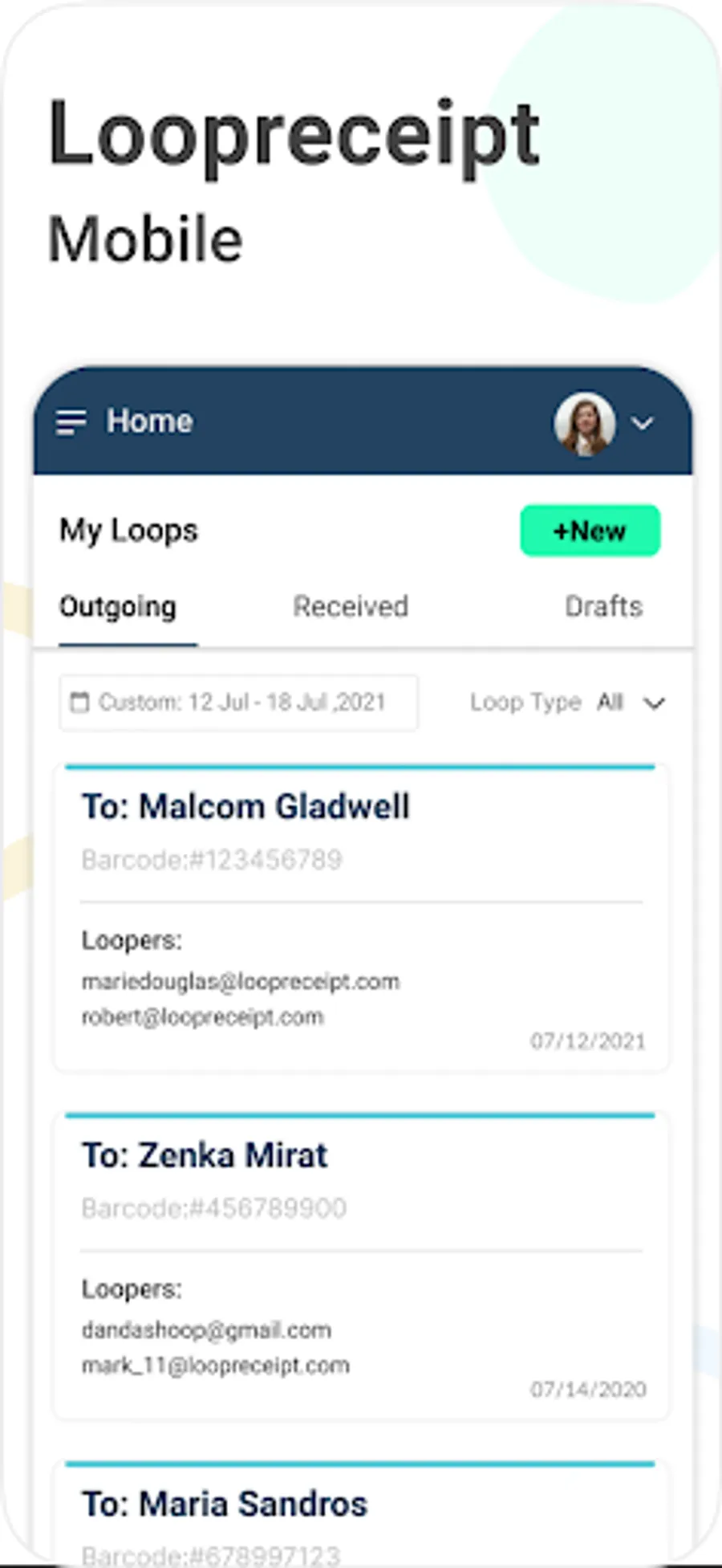 • See the data for all your Loopreceipts, including your total number of outgoing and incoming Loops, internal and external Loopreceipts, delivery date and time