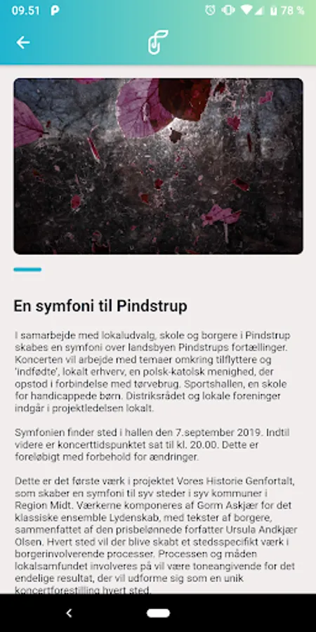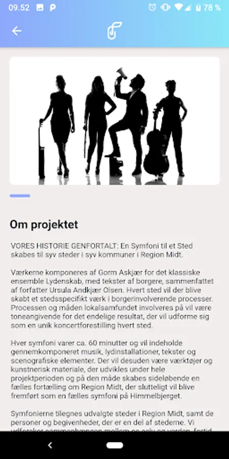 With this app you can follow the project Our History Retold: A Symphony For A Place that creates citizen-engaging art dedicated to Danish local areas. The works of art are created in seven places in seven municipalities in the Region Midt in the period 2019-2022 and composed by Gorm Askjær for the classical ensemble Lydenskap, with texts by citizens, summarized by the award-winning author Ursula Andkjær Olsen. Each symphony is performed at a concert on site, but can also be experienced in a remixed version on this app.
