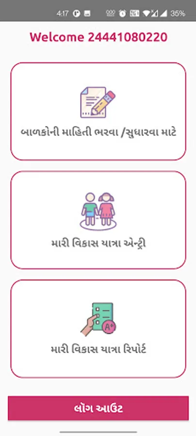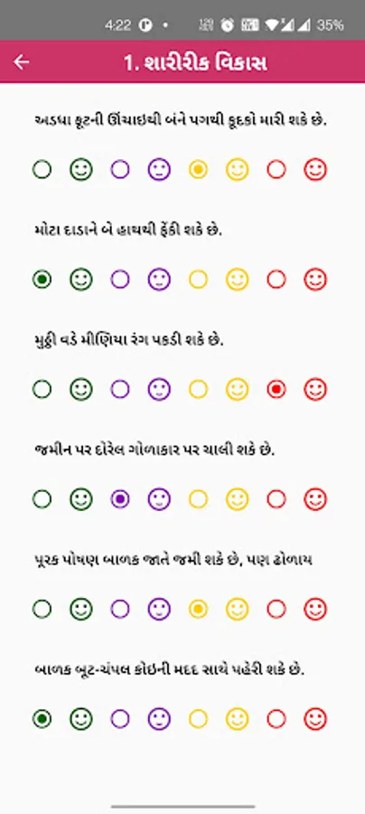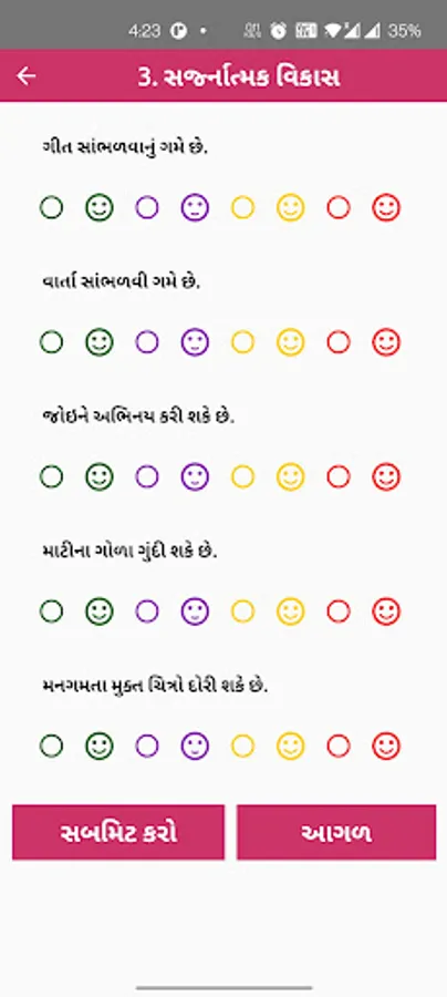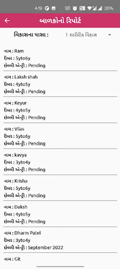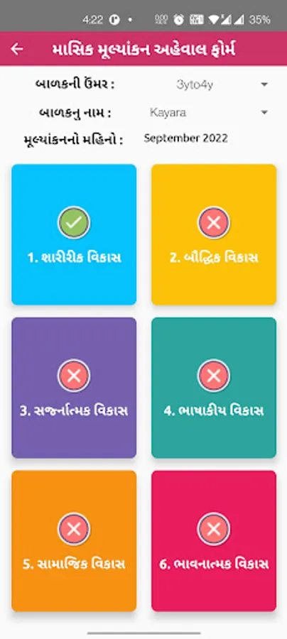 This application will be used to assessed development progress of 3 to 6 years children under the Government Scheme "Mari vikas Yatra" which is implemented by Gujarat Government Department of Women and Child Development, based on the entries system will generate reports indicating development progress under six domains named Physical Development, Mental Development, Creativity Development, Language Development, Social Development, Emotional Development.