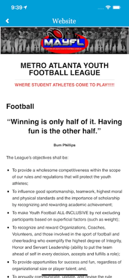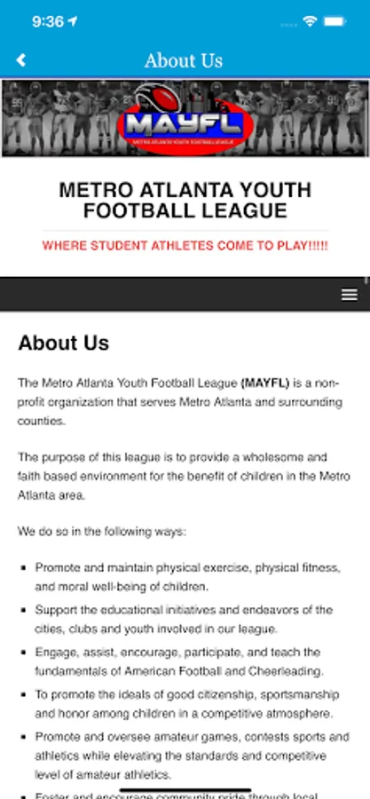 Provides information to parents, spectators, and participants on the Metro Atlanta Youth Football League. Information, concerning our Academic program, Cheer, and Football programs are all included. Including giving our audience an opportunity to be a part of a family-oriented group.