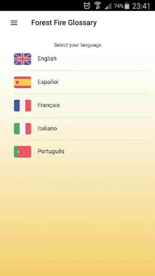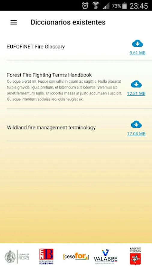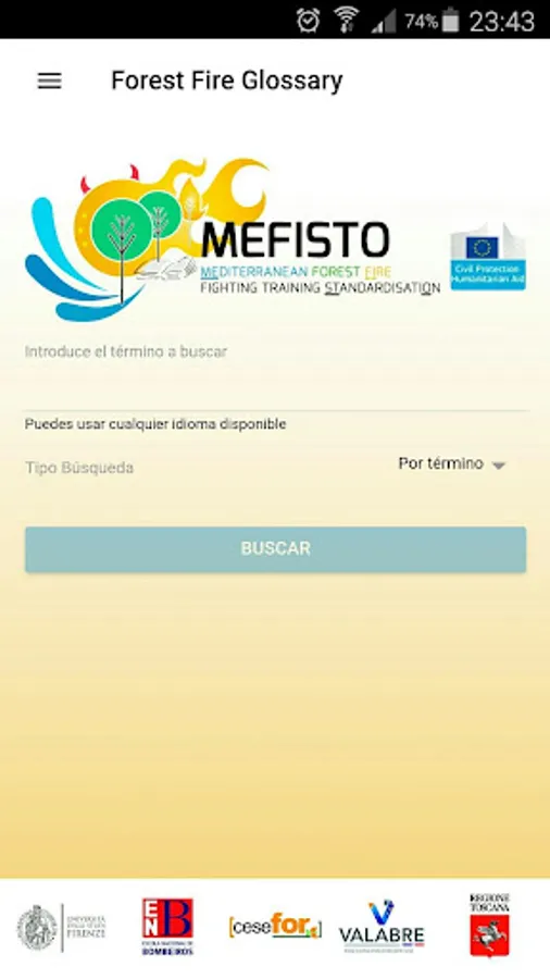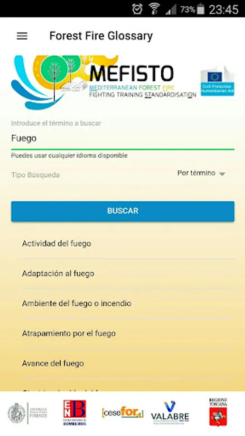 The MEFISTO European Forest Fire Fighting Multilanguage Glossary mobile app allows a quick translation of terms and definitions among the five languages. A search function makes very easy to search for translation of specific terms. Another function allows sorting the terms included in the glossary in alphabetical order.