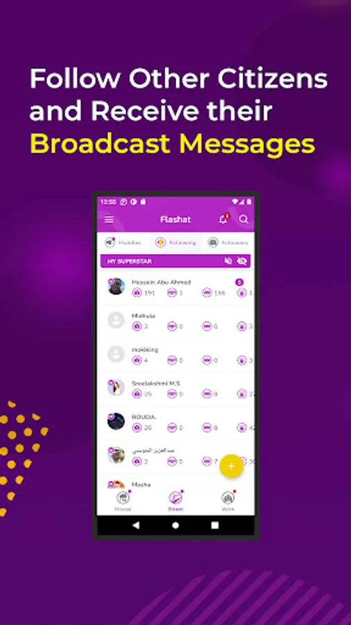 PUBLIC: Explore a more public platform in the Public Tab. Experience wider connections with the public group messaging feature - Groups. Stars Tab will list your SUPERSTAR on the top and all the users you follow will be listed under your SUPERSTAR as your Stars. Likers Tab will list all users who selected you as their STAR to follow your Broadcasts.