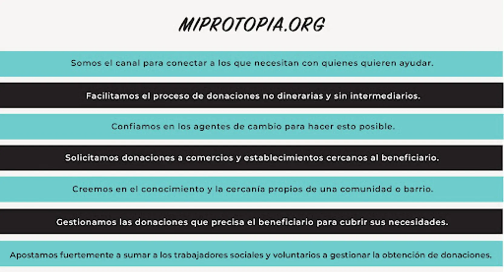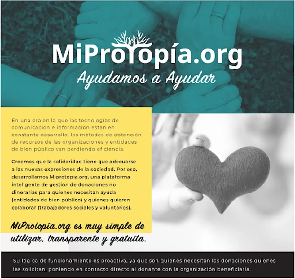 Creemos que la solidaridad tiene que adecuarse a las nuevas expresiones de la sociedad. Por eso, desarrollamos Miprotopia.org, una plataforma inteligente de gestión de donaciones no dinerarias para quienes necesitan ayuda (entidades de bien público) y quienes quieren colaborar (trabajadores sociales, voluntarios y ciudadanos como vos).