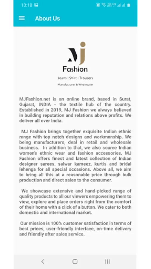 MJFashion.net is an online brand, based in Surat, Gujarat, INDIA - the textile hub of the country. Established in 2019, MJ Fashion we always believed in building reputation and relations above profits. We deliver all over India.