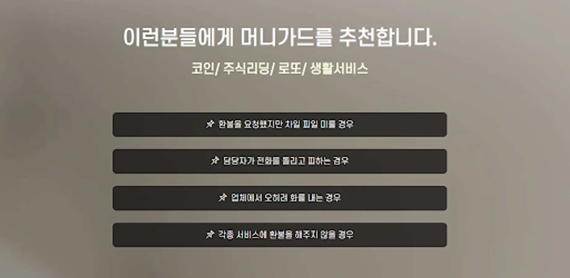 Various life services (refusal of refund at gym, refusal of refund for Pilates, refusal of refund for school, refusal of refund for wedding) are increasing day by day. From the point of view of a company, customers are always the weakest in the ecosystem because they have more information and power than each individual. MoneyGuard identifies this ecosystem and discovers your rights through collaboration with experts in each field.