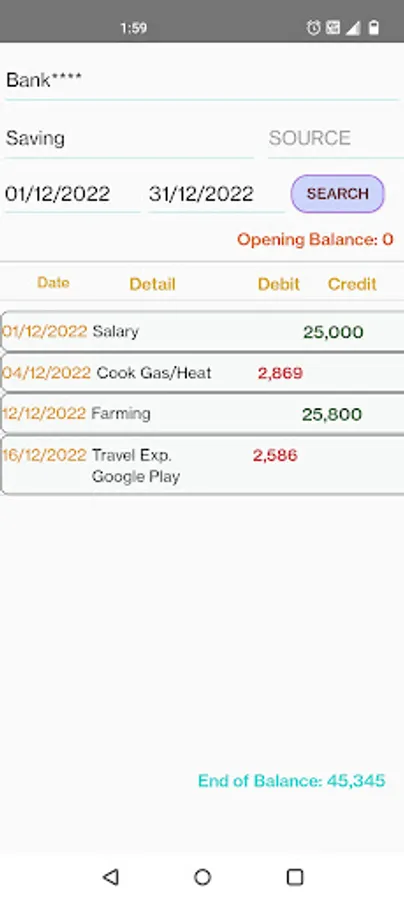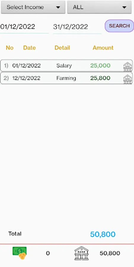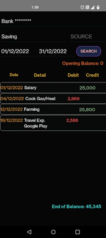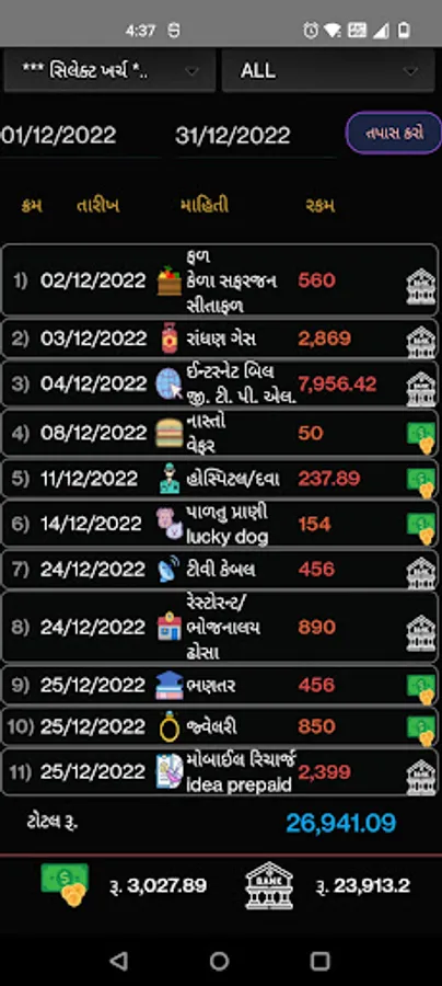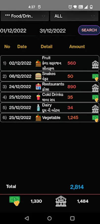 Expenses/Income Screen: Money manager app allows you to add expenses and income information with extra details. You can also add your transaction is cash or bank. You have simple drag drop selection option for expenses and income details. You can enter bank detail like bank name, account number or type and transaction source NEFT, RTGS, Google pay, Apple pay or various online pay methods, credit and debit cards in bank through transaction. You can set default bank account and source for income and expense transaction, so next time bank transaction no need to repeat bank details.