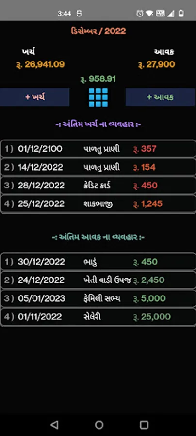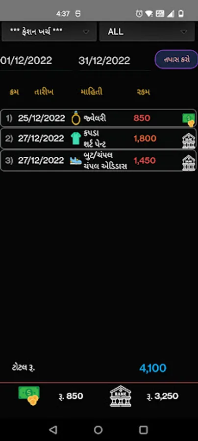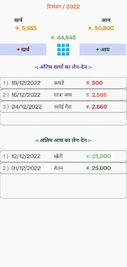 Expense/Income Report Screen: you can review your expenses and income (budget) daily, monthly, yearly basis. You can update/delete record of your transaction from reports. You want update or delete transaction, that for you will need long press on transaction.
