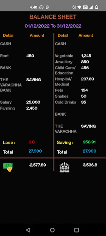 Money manager app provides additional features of balance sheet report. Its date wise provide combine records of expenses and income (budget). You can easily review of budget and expenses. And, you can see current position of your budget.