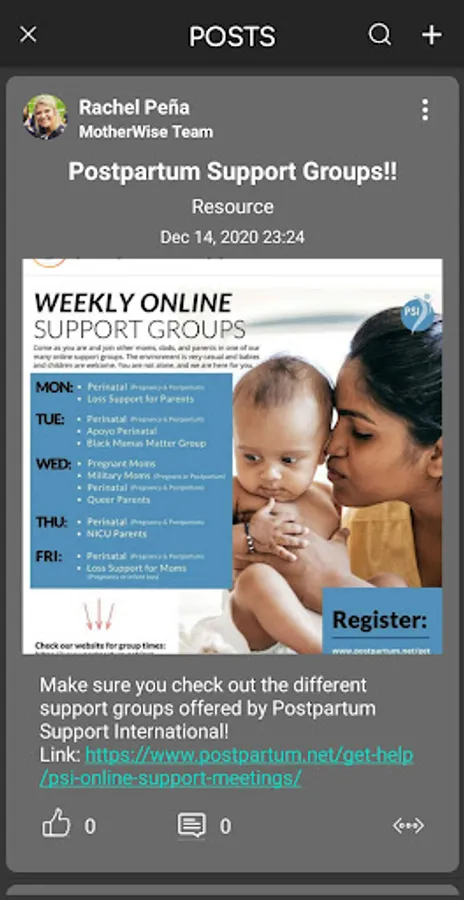 Puede publicar artículos, compartir consejos sobre embarazo y nuevos bebés, ver videos y chatear directamente con otras madres. ¡También se mantendrá al tanto sobre todos los nuevos programas y eventos especiales que MotherWise tiene para ofrecer!