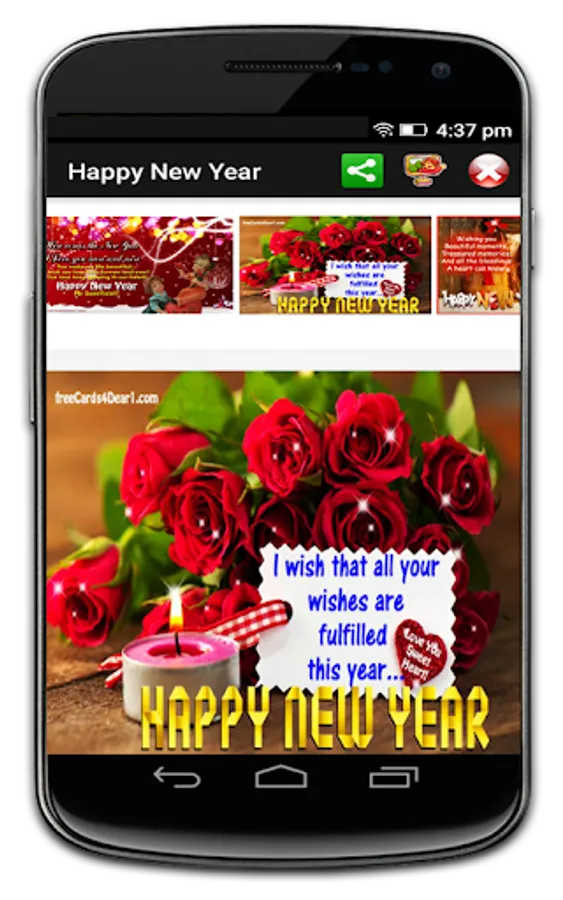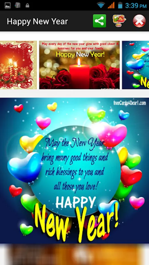 You can easily share your favorite e-card by clicking Share button at the top of the application at the action bar via your favorite social network such as Facebook, whats app or you can email it.
