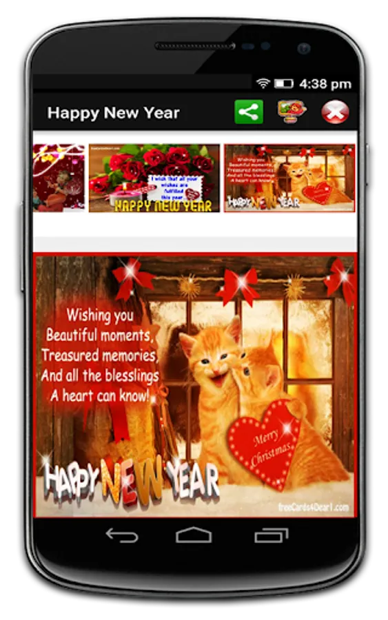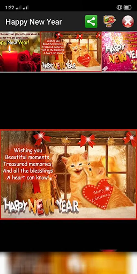 This app includes very beautiful elements in the cards such as flowers, roses, candles, fireworks, Xmas tree, Xmas bulbs, Santa clause, hearts, kitten, cat etc.