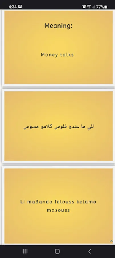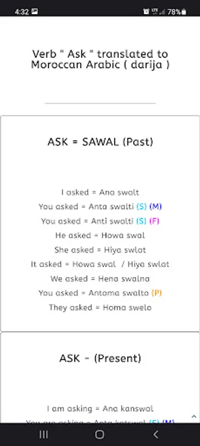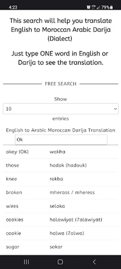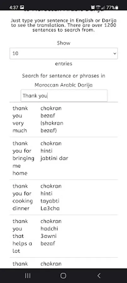 There is thousands of words and sentences to learn. With mydarija app you will learn pretty much everything about Morocco Arabic (Darija). It is translated from English to Moroccan Arabic Darija.