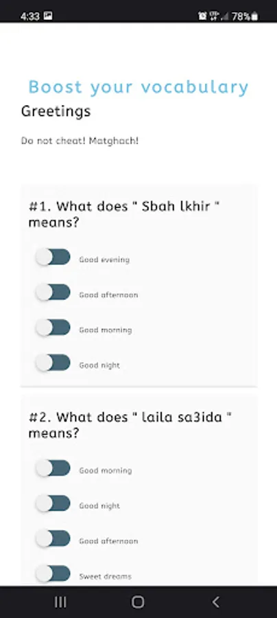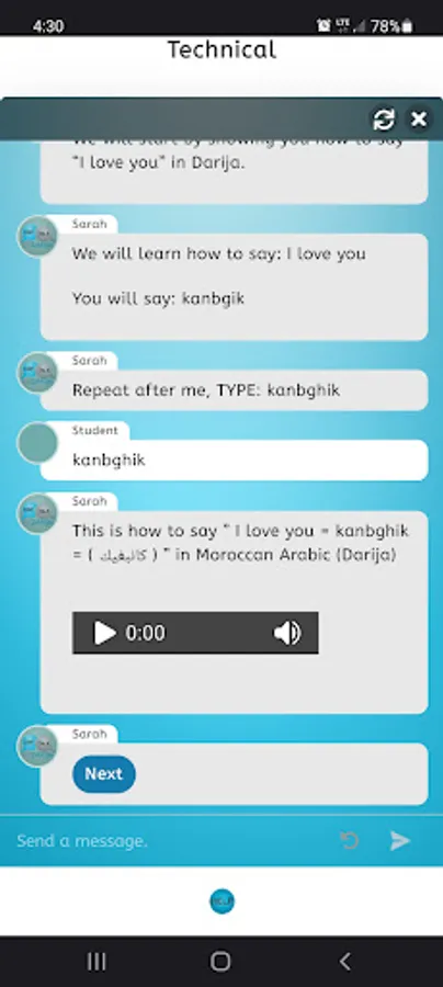 It is an advanced feature with prebuilt lessons to help you learn Darija. It includes lessons and reviews. You can also practice what you have learned by having a conversation with the auto teacher. All the lessons have audio. The lessons will ask you to repeat what is taught so you can learn faster. It starts by teaching general information.