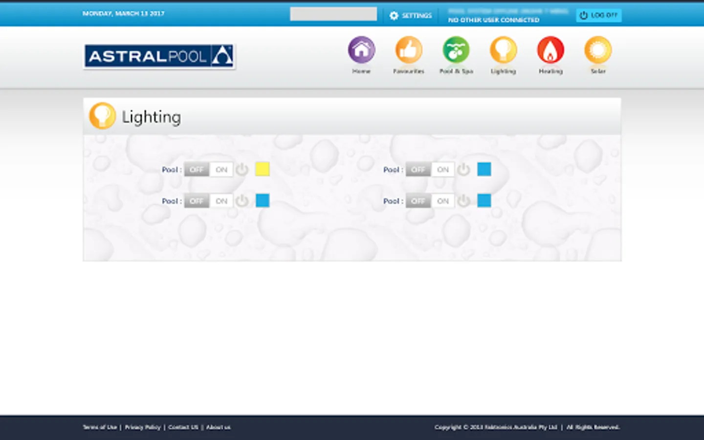 • Turn on and off your pool lighting, and change their colours.