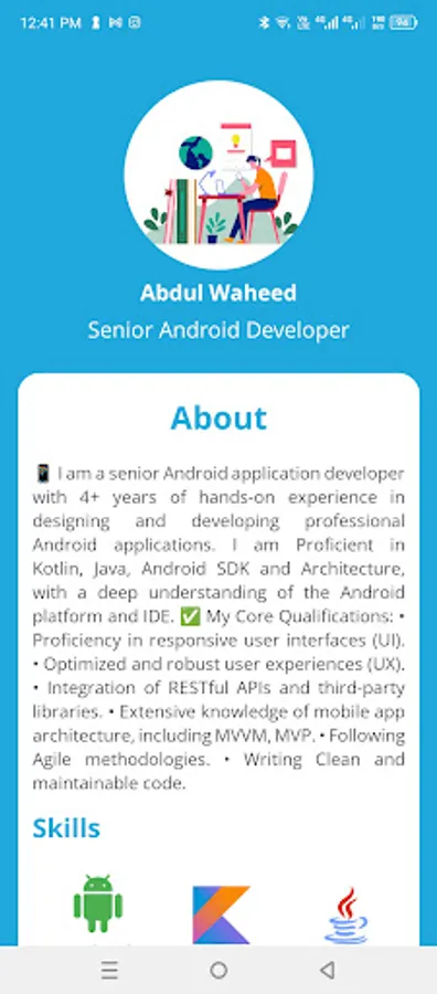 My Name is Abdul Waheed and I am Native Android application developer. This app is portfolio of work and other information.