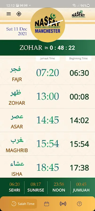 Nasfat Masjid Timetable app features prayer times and comes with an accurate qibla finder.