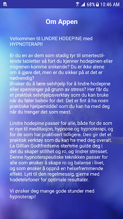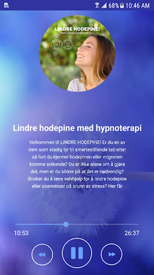 Relieve headaches suitable for everyone, both for those who are new to meditation, hypnosis and hypnotherapy, and for those who have practiced before. It gives it a handy tool that you can carry with you everywhere. Let Gillian Godtfredsen voice guide you in what you create silence and tranquility, and relieves stress. This hypnoterapeutiske technique suitable for anyone who wants to create peace and balance in their lives and who want to achieve beneficial effects. Listen to it regularly, preferably with headphones for optimal results.