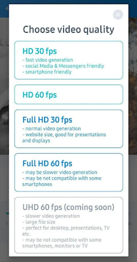 - choice of HD, FULL HD and UHD 4K video with30 and 60 fps