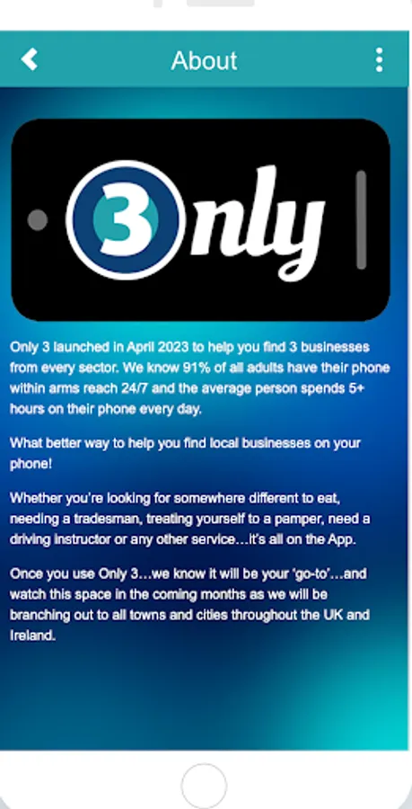 FREE to download directory APP showcasing businesses and services in locations across the UK. Whether you’re looking for somewhere different to eat, needing a tradesman, treating yourself to a pamper, need a driving instructor or any other service…it’s all on the App. Once you use Only 3…we know it will be your ‘go-to’…and watch this space in the coming months as we will be branching out to all towns and cities throughout the UK and Ireland.