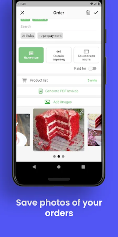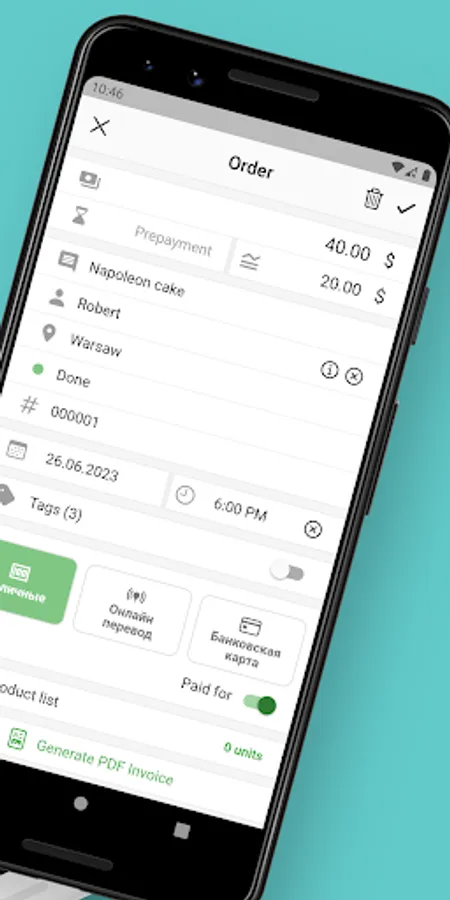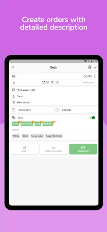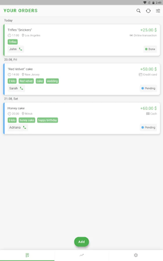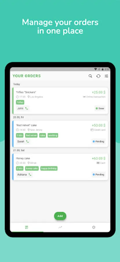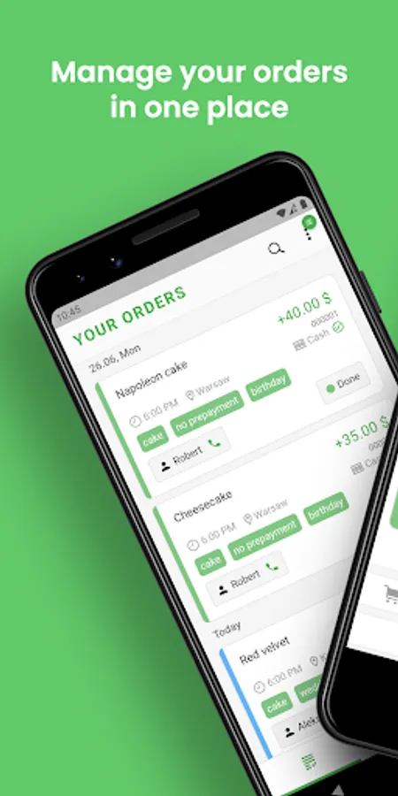The list of orders with all the necessary additional information is always stored on your phone and is at your fingertips. Our application will help you keep all the data in one place and you don't have to write them down on sheets of paper and in notes. As a result, you can not worry that you have forgotten about someone or something.