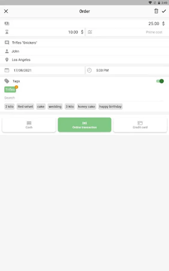 - Specify the order cost, prepayment, cost price, time, place, delivery address and payment method preferred by the customer.