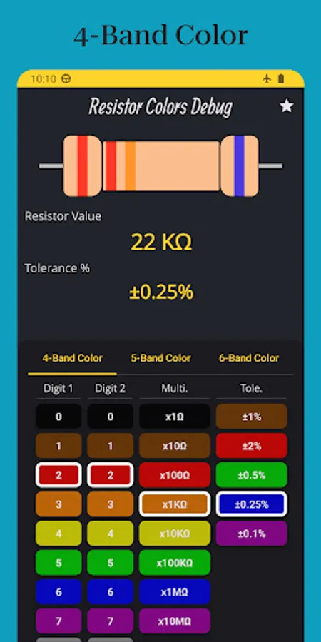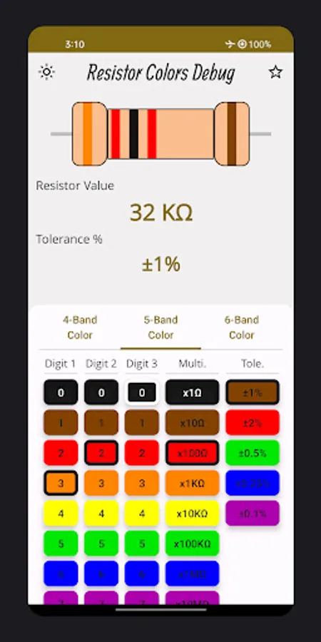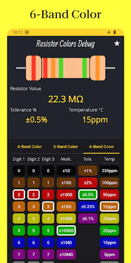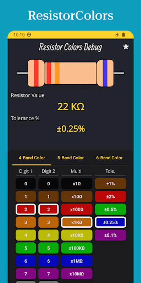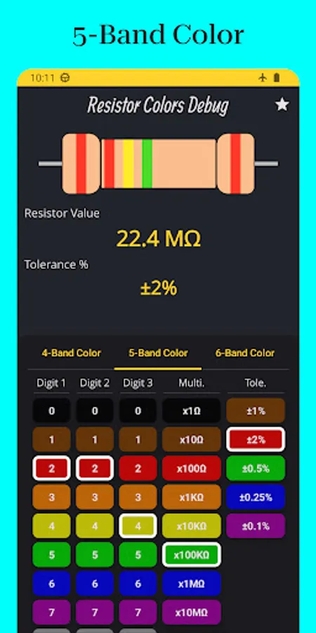 and show value by Ohm, this app support all resistor bands 4,5,6 bands.