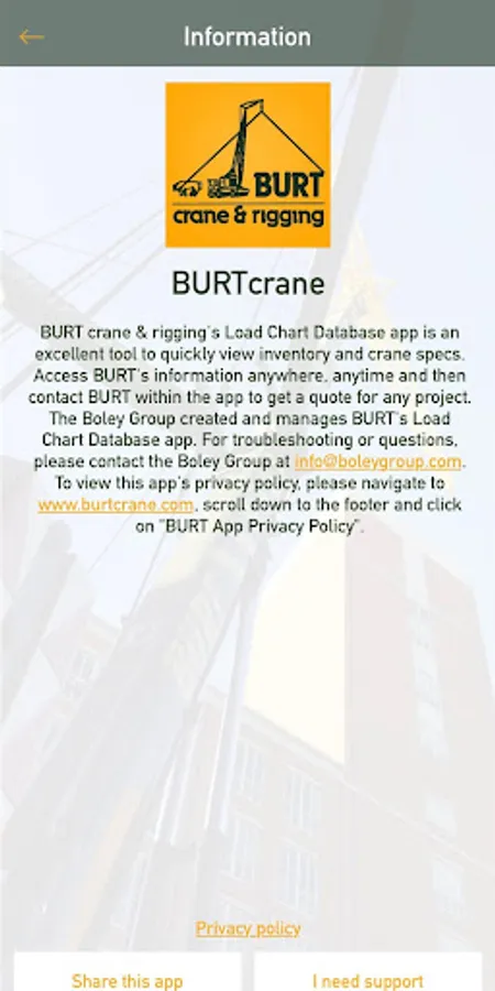 BURT crane & rigging's Load Chart Database app is an excellent tool to quickly view inventory and crane specs. Access BURT's information anywhere, anytime and then contact BURT within the app to get a quote for any project. Blaue Reiter Design created and manages BURT's Load Chart Database app. For troubleshooting or questions, please contact Blaue Reiter Design at info@bluerider.design. To view this app's privacy policy, please navigate to www.burtcrane.com, scroll down to the footer and click on "BURT App Privacy Policy".