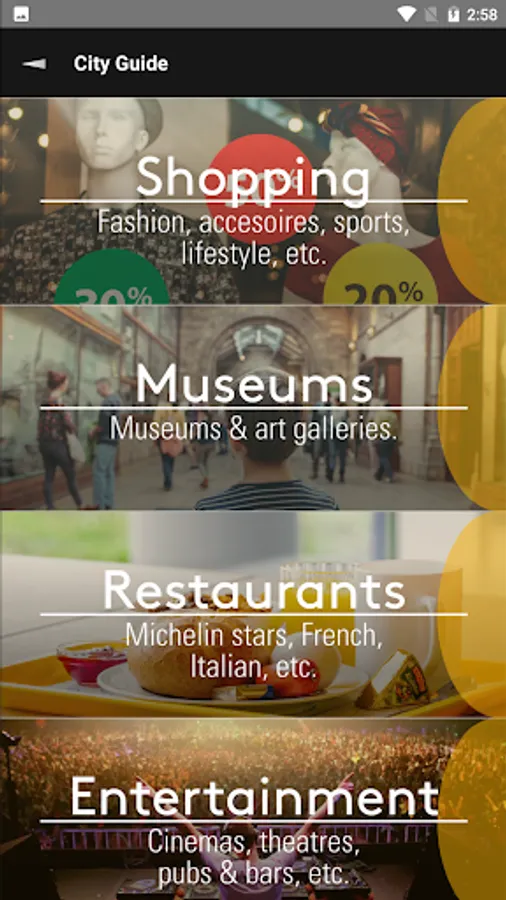 Detailed digital city map showing where you are and where your chosen venue is, including distance and navigation. Clearly marked shopping and nightlife areas.