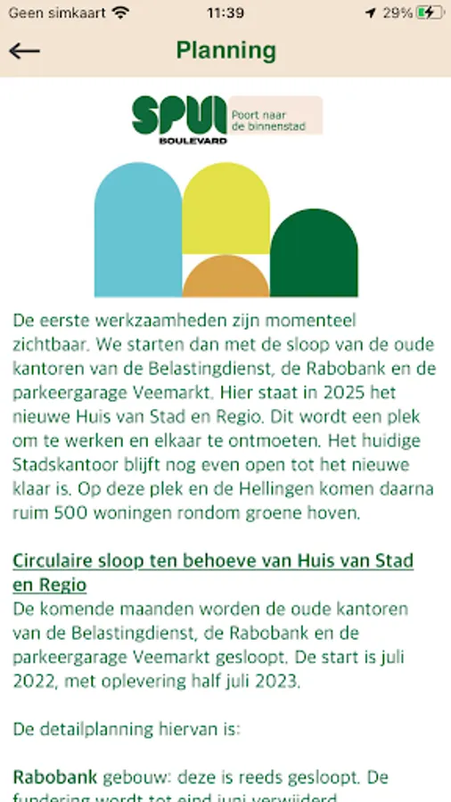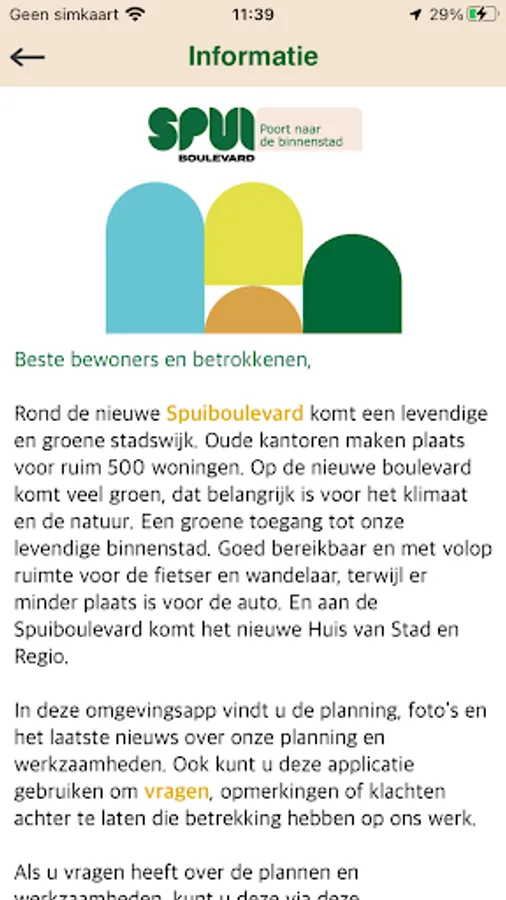 In this app you will find all information about the activities of the Spuiboulevard Dordrecht project. Relevant agenda items, the latest schedule and contact information are displayed. You can also leave questions, comments or complaints about the project on this app. Note: make sure you have checked 'automatic updates' of your apps in settings on your phone. This way you can see the latest developments about Spuiboulevard.