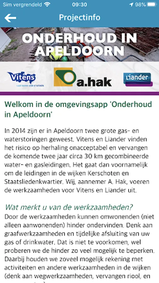 In this app you will find all information about the work of the project 'Maintenance in Apeldoorn'. Important project information, the latest planning and contact information are displayed. You can also leave questions, comments or complaints related to the project on this app.