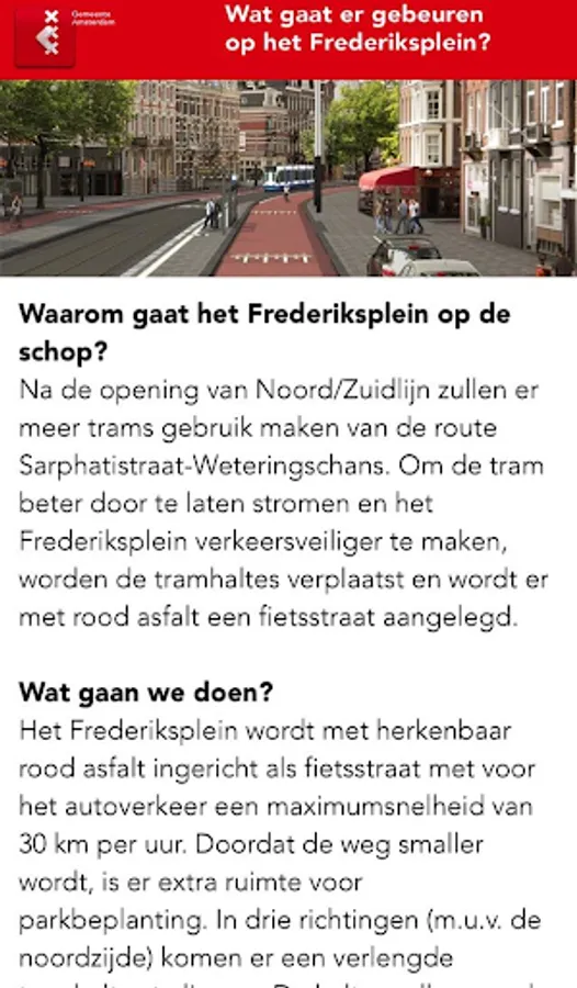 The entire Sarphatistraat becomes a cycle street with red asphalt. Cyclists get more space and the car is a guest (maximum speed 30 km per hour). The part of the Sarphatistraat between Weesperplein and Alexanderplein has already been completed.