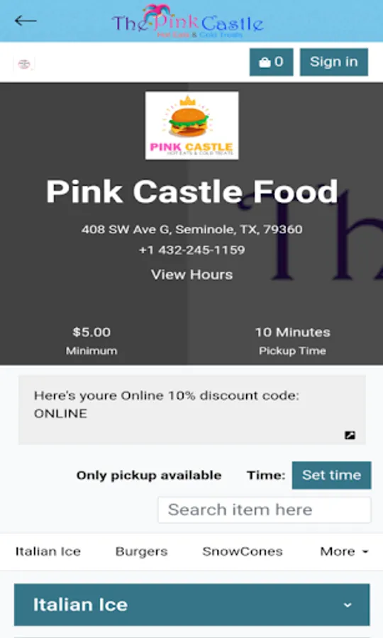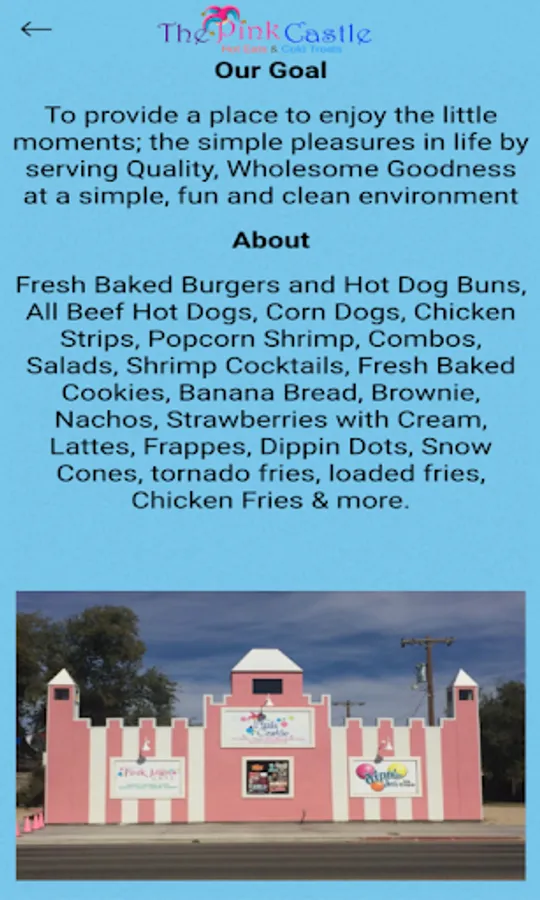 Pink Castle's mobile app for online ordering. Place an order for our: Fresh Baked Burgers and Hot Dog Buns, All Beef Hot Dogs, Corn Dogs, Chicken Strips, Popcorn Shrimp, Combos, Salads, Shrimp Cocktails, Fresh Baked Cookies, Banana Bread, Brownie, Nachos, Strawberries with Cream, Lattes, Frappes, Dippin Dots, Snow Cones, tornado fries, loaded fries, Chicken Fries & more; all from our mobile app.