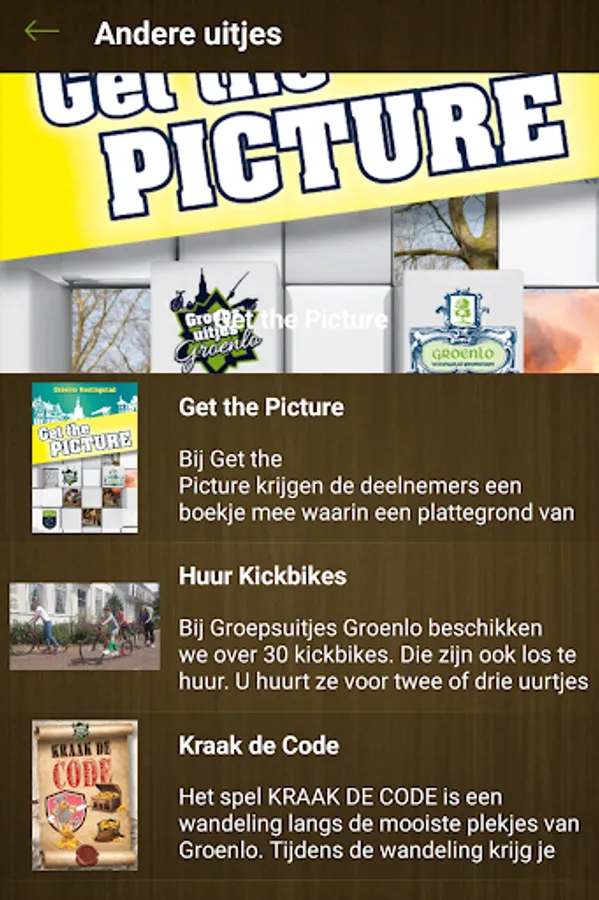 For the detectives and puzzlers we made Get the Picture. You walk from detail photo to detail photo and a multiple choice question is asked for each photo. Once you have found the detailed photo, take a photo of the bigger picture and at the end you can see all the correct twenty detailed photos via the Answers button. You can earn a total of twenty points and this score is shown after the last question. You can let everyone know via social media how well you have completed Get the Picture.