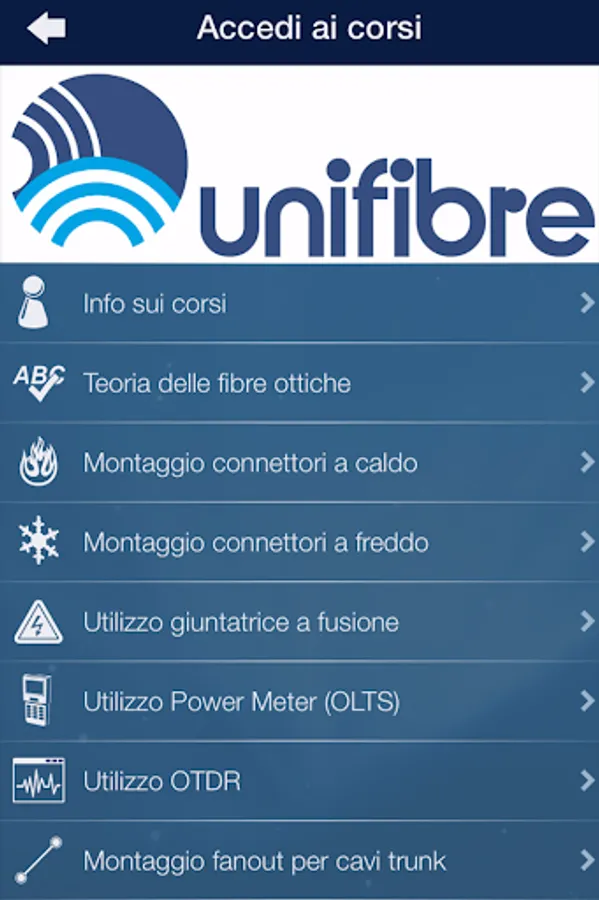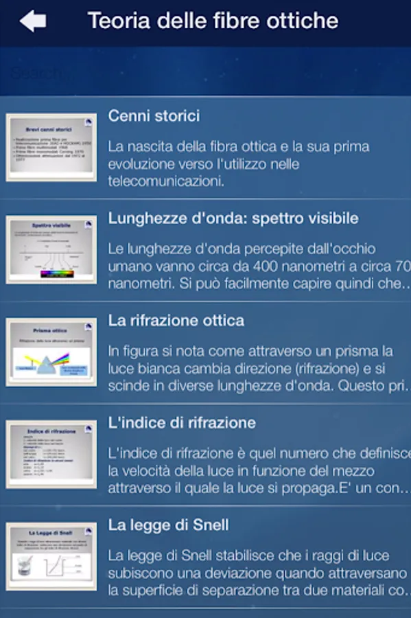 FIBERPRO is the only mobile app that contains all technical education courses on the processing and testing of fiber optics for telecommunications and data transmission. FIBERPRO is the essential app for technicians working in the sector of optical fibers. With FIBERPRO you can have, in the yard or in the office, all the technical information about various issues related to 'use of fiber optics. FIBERPRO is not only used by the installation, but also to all those who want to deepen their technical knowledge, such as designers, traders, researchers and teachers.