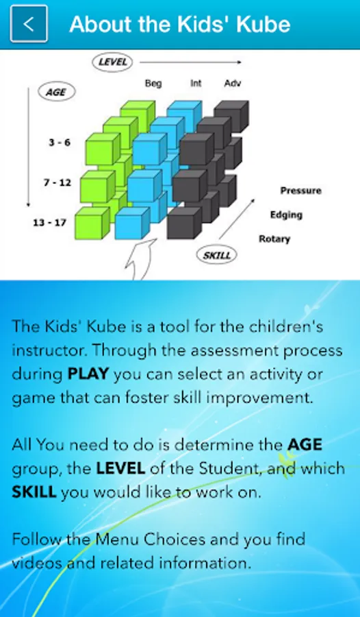 This app will help guide the way to providing an effective activity or game, specifically geared toward your students. The app features activities for 3 distinctive age groups, 3-6, 7-12, and 13-17 years old.  Once you choose the age group you’re working with, you can choose from 3 different ability zones; beginner, intermediate, and advanced.  Easy!  From there pick a skill; rotary, edging, and pressure.  Again, easy!  The videos are all less than 2 minutes and downloadable from YouTube.  In some instances there is a written description of an activity rather than a video clip.