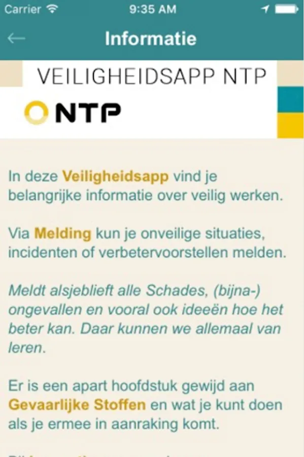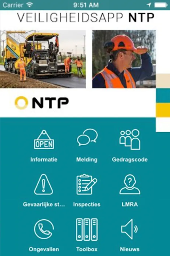 This is the NTP Safety app. It contains everything about what to do in unsafe situations and unsafe situations can be reported. New information about working safely is regularly placed in this app and workplace inspection can be carried out.